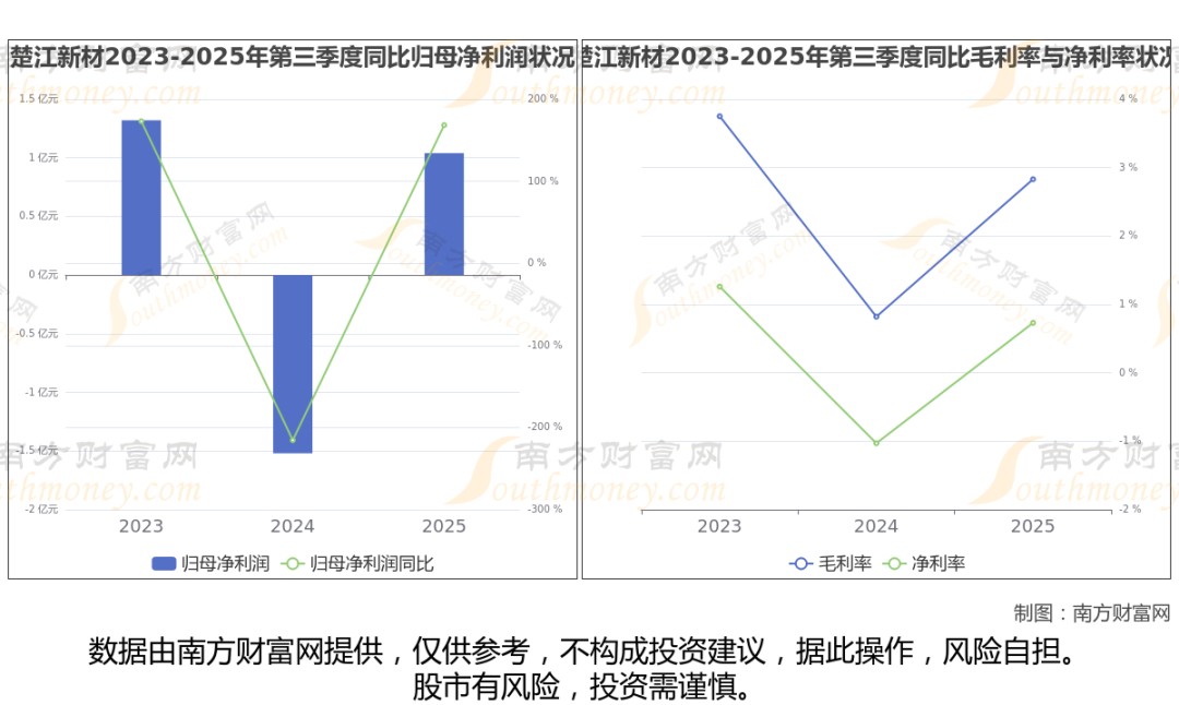 2025年第三季度季报显示,楚江新材公司实现净利润1.04亿,同比上年增长率为168.41%,毛利率2.83%,归属净利润1.04亿,同比增长168.41%。