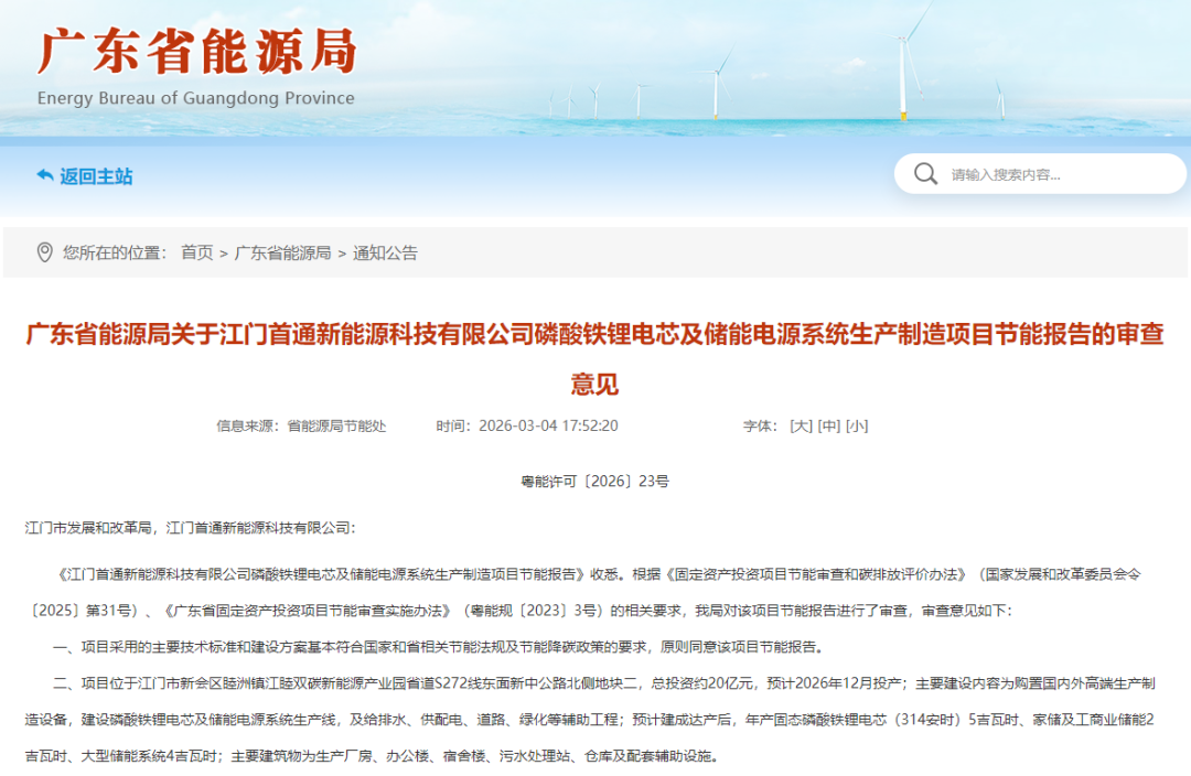近日,广东省能源局正式批复同意江门首通新能源科技有限公司“磷酸铁锂电芯及储能电源系统生产制造项目”节能报告。该项目总投资20亿元,位于江门市新会区江睦新能源双碳产业园,计划于2026年12月投产。项目由深圳市首通新能源集团有限公司投资建设,分两期实施,总用地179亩。建成后将形成年产5GWh磷酸铁锂电芯、2GWh家用及工商业储能系统、4GWh大型储能系统的产能,合计储能系统产品达6GWh。主要产品包括314Ah方形铝壳磷酸铁锂电芯及集成化储能电源系统,应用于家庭、工商业及电网侧储能场景。首通新能源成立于2017年,总部位于深圳,现有2.5GWh软包电芯产线,产品覆盖50Ah–280Ah磷酸铁锂电池,并已应用于通信基站、低速电动车、光伏配套及智慧路灯等领域。此次江门项目是其首次大规模转向方形铝壳电芯和系统集成制造,标志着公司从消费类及小动力市场向大储领域战略升级。据此前披露,项目达产后预计年产值超14.4亿元,年纳税7200万元以上。首通集团为北京首通投资控股有限公司全资子公司,专注于新能源终端解决方案。此次项目落地江门,将进一步完善粤港澳大湾区储能产业链布局