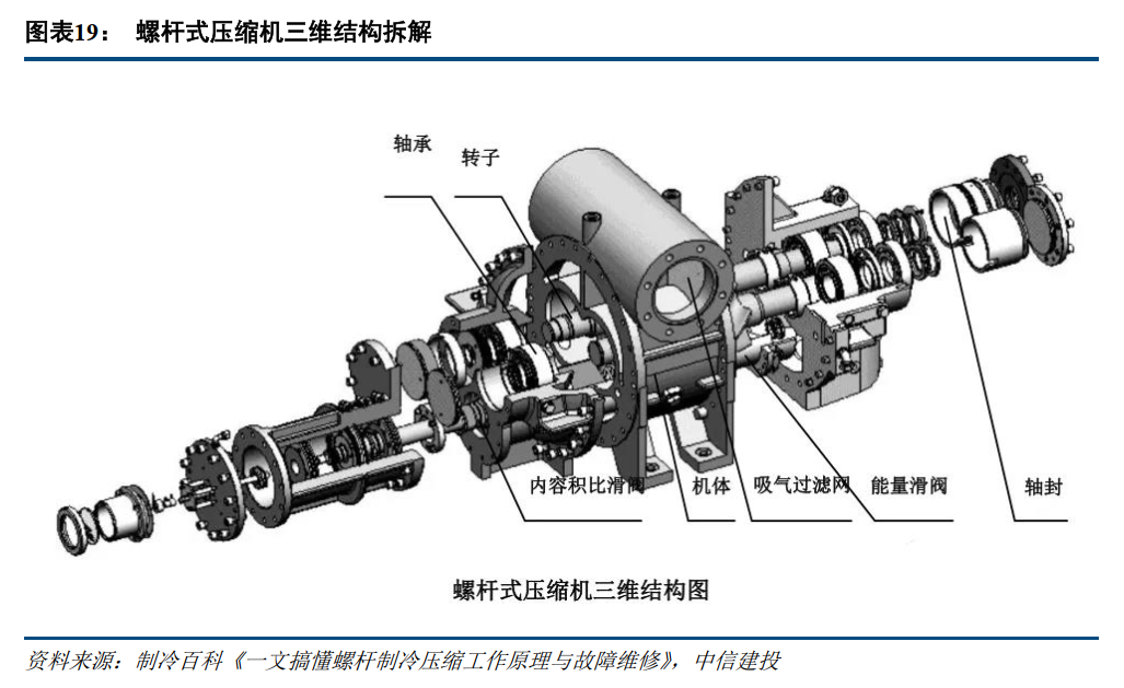 压缩机按国家标准可分为容积式与动力式两大类,行业应用最广泛的有五类机型,按照不同功率范围适配不同应用场景。根据国家标准《压缩机分类》(GB/T 4976-2017),压缩机可分为容积式和动力式两类。容积式压缩机通过改变工作腔容积提高气体压力;动力式压缩机通过提高气体流速、将动能转化为压力能实现增压。按运动形式不同,容积式压缩机又可分为往复压缩机与回转压缩机。往复压缩机依靠活塞往复运动或膜片反复变形实现压缩;回转压缩机通过转子回转运动使工作容积周期性变化完成气体压缩。目前制冷行业应用较广的压缩机主要有五大类:活塞式压缩机(全封闭、半封闭、开启式)、转子式压缩机、涡旋式压缩机、螺杆式压缩机(半封闭、开启式)、离心式压缩机,各类产品在不同场景下各具优势。