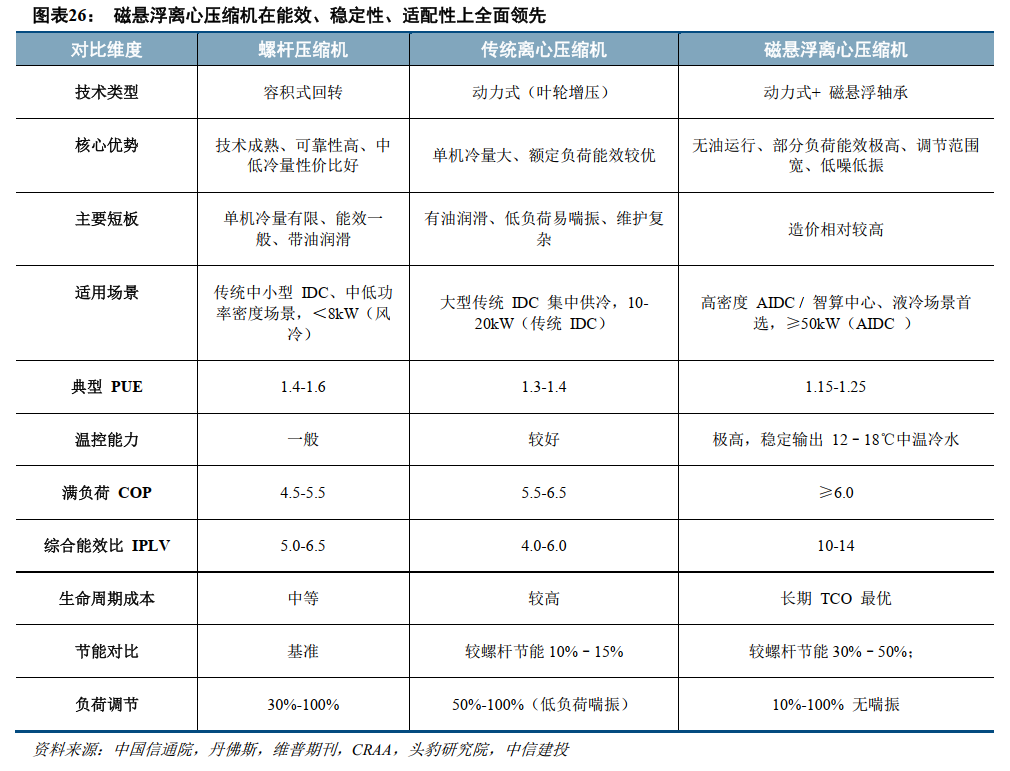 综合来看,在数据中心从IDC逐步向AIDC发展过程中,冷水机组用压缩机呈现三大变化趋势,首先是技术方案迭代加速,压缩机从螺杆、传统离心向磁悬浮离心升级,在AIDC 领域渗透率快速提升;其次,性能向大冷量、高能效、低温化发展,单机冷量与运行效率不断突破,支撑单机柜功率持续上移;最后是国产替代加速,磁轴承、高速电机、控制系统等核心技术逐步突破,本土厂商份额稳步提升。