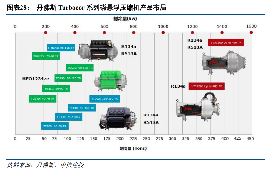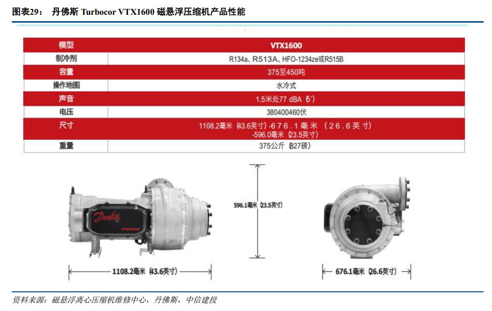 在磁悬浮压缩机领域,欧洲厂商丹佛斯是绝对的全球龙头。丹佛斯发展历史悠久,是丹麦最大的工业集团,也是全球无油压缩机制造商及技术先驱,成立于1933年,旗下品牌Turbocor早在1995年即推出全球第一台磁悬浮制冷剂压缩机,至今已有30年的磁悬浮制冷压缩机的研发历史。丹佛斯Turbocor品牌全球累计销量突破16万台,全球磁悬浮压缩机市场份额高达70%,国内市场份额接近50%。其VTX-1600系列磁悬浮离心压缩机COP达6.83,IPLV约11.86,可稳定适配AIDC 12–18℃中温冷水需求,满足单机柜50kW 高密度散热场景,深度绑定全球头部云厂商与智算中心。