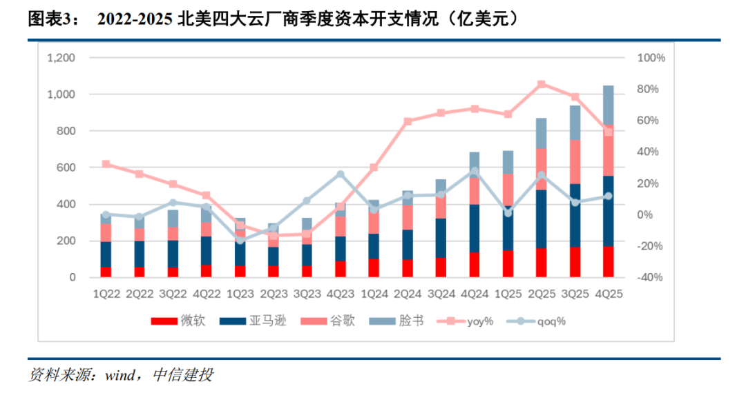 本轮全球算力基础设施建设提速主要源自国内外大型科技企业持续的资本开支增加。自2022年以来,北美四大云厂商为代表的国内外大型科技企业资本开支经历了显著的周期性变化。2022年至2023年上半年,受宏观经济逆风及疫情后需求变化影响,资本开支增速放缓甚至出现负增长。然而,自2023年下半年起,受生成式AI技术突破驱动,无论是海外的科技巨头,还是国内的互联网大厂,均在人工智能基础设施上投入重金,开启了新一轮激进的“AI军备竞赛”,资本开支在2024年和2025年呈现爆发式增长,主要资金流向AI基础设施,主要包括购买GPU和定制芯片、建设或租赁大规模智算中心、采购配套能源设施等,以应对大模型训练与推理带来的算力挑战。2025年全球各大云厂商均宣布了近千亿美元级别的资本开支计划,核心投向用于AI训练和推理的GPU集群,其中OpenAI正计划到2030年累计投入约6000亿美元用于算力支出,字节跳动初步规划2026年资本开支1600亿元人民币,较2025年同比增长7%,阿里云则在未来三年3800亿元资本开支基础上额外增加投入。