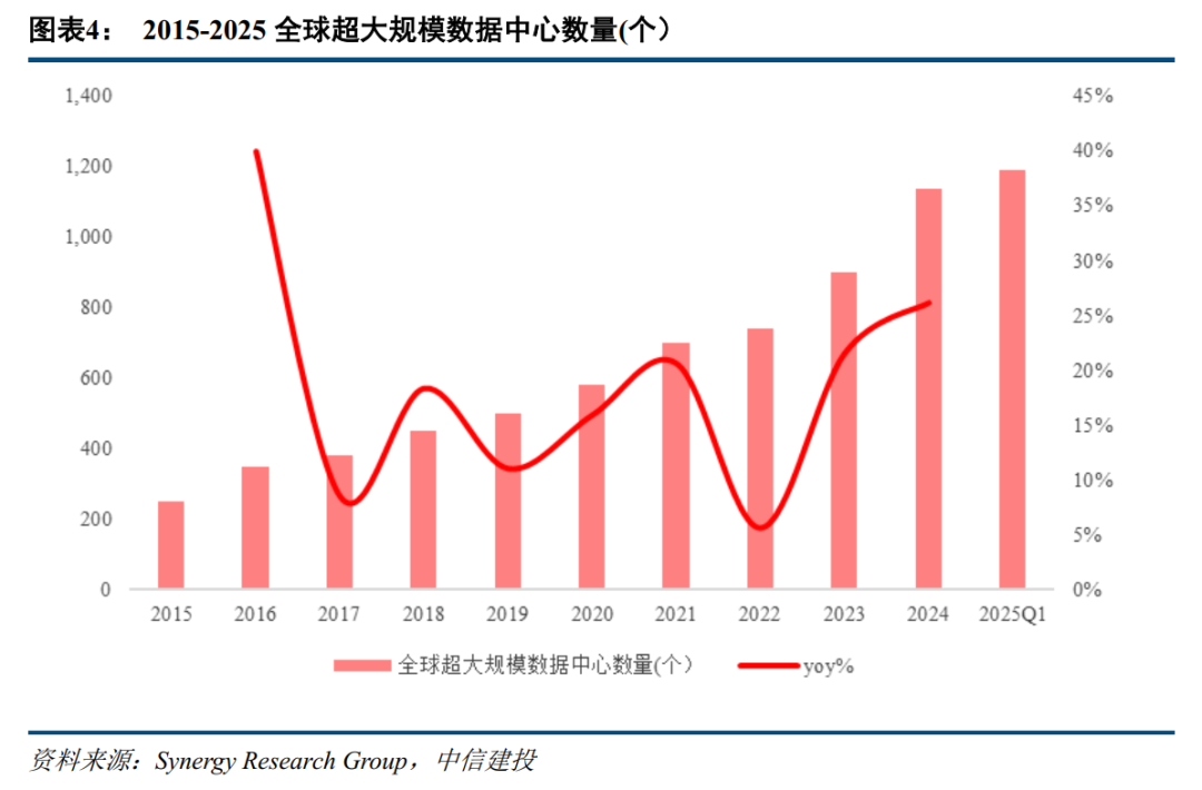 AIDC作为AI产业的核心算力基座,其建设规模与增速与AI行业发展高度相关,当前全球算力技术设施建设正进入新一轮快速发展期。根据科智咨询与Global Growth Insights数据,2021年全球数据中心市场规模为765.6亿美元,预计2026年将达到1459.2亿美元,2027年将增至1632.5亿美元,到2035年将进一步达到2621.5亿美元以上,未来十年全球AIDC市场将呈现高速增长态势。国内市场方面,根据工信部数据显示,截至2025年6月,我国在用算力中心标准机架达1085万架,智能算力规模达788EFLOPS,干线400G端口数量大幅增加至14060个,存力总规模超过1680EB,全国算力中心平均电能利用效率(PUE)降至1.42,算力基础设施规模和水平不断提升。与此同时,大型以上算力中心机架数量占算力中心总机架规模比重逐年上涨,部分超大型算力中心的平均单机柜功率已达20kW,高功率密度、高算力的大型、超大型算力中心已经成为未来建设的重点。