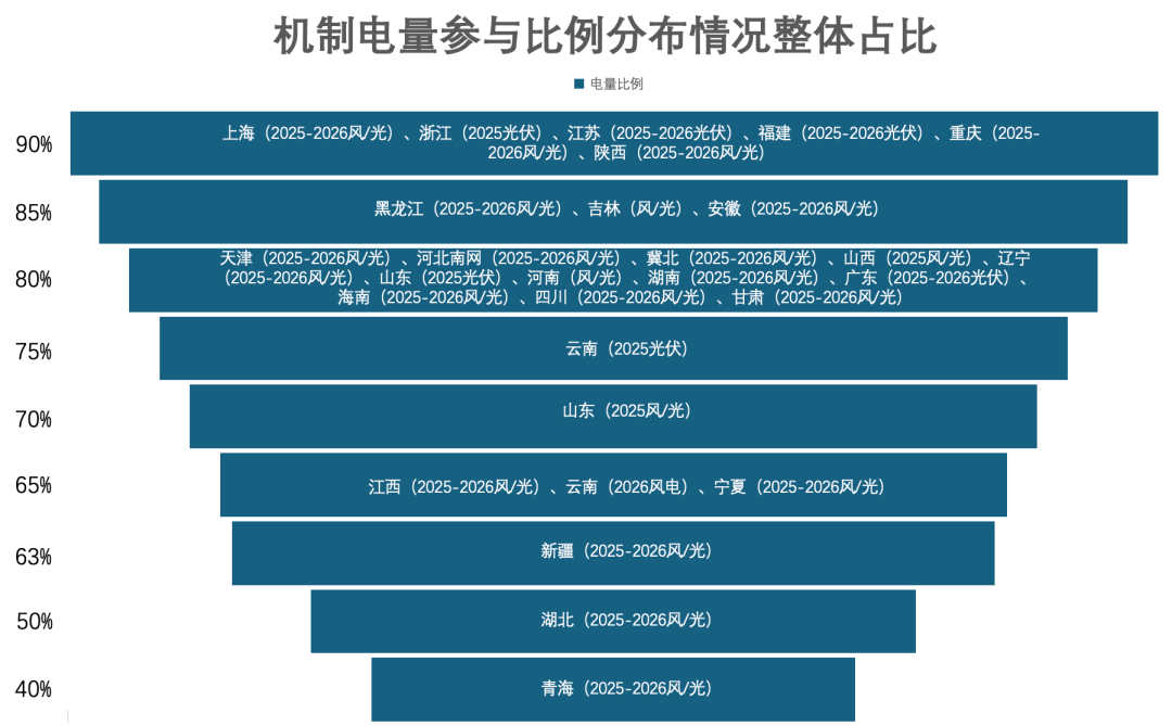 2025-2026年各省新能源机制电量参与比例呈现显著区域差异,多数省份风光机制电量比例集中在70%-90%,北京统一竞价比例达100%,2026年新疆省份比例有所调整,部分省份风电与光伏机制电量占比存在分化。机制电量比例设定与区域新能源资源禀赋、市场化程度相适配。