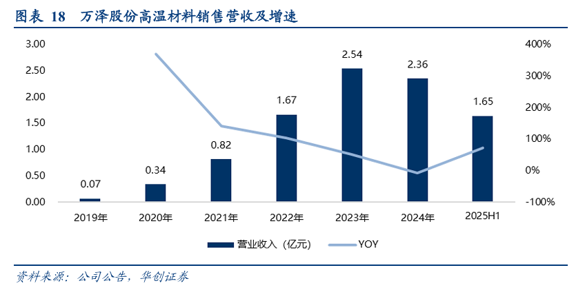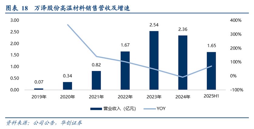 随着客户的增加以及在手核心客户订单的持续执行,公司高温合金业务收入规模显著提升,高温材料销售营收由2019年的720万元增长至2024年的2.36亿元,期间复合增长率达101%。