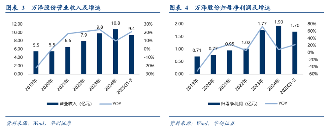 万泽股份自2019年完成战略转型后,营收进入稳健增长通道,2019-2024年营收CAGR达14.5%,归母净利润于2023年后站上新台阶,23-24年归母净利分别为1.8及1.9亿元。