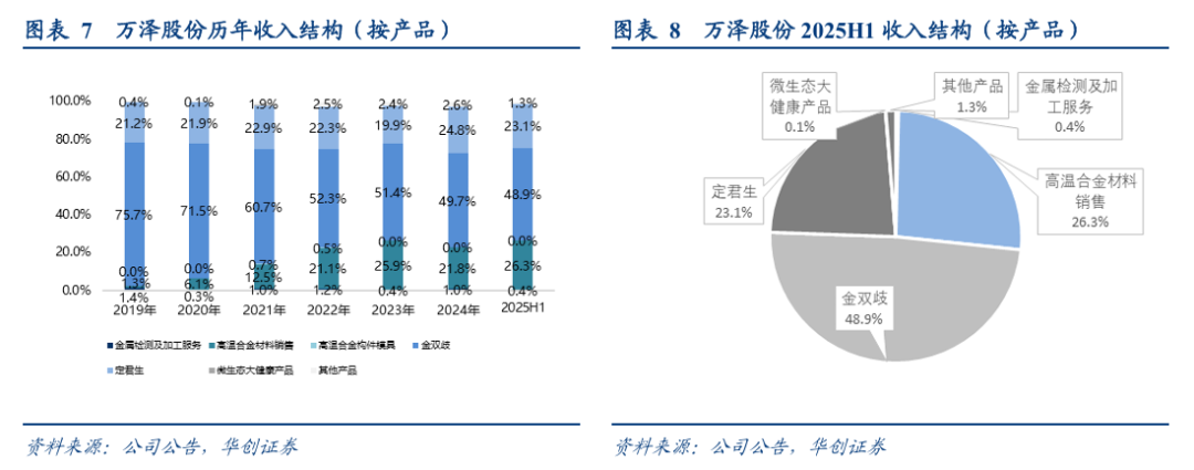 2025年上半年,万泽股份总营业收入为6.25亿元,同比增长24.4%,其中金双歧实现营业收入3.06亿元;高温合金材料销售实现营业收入1.65亿元;定君生实现营业收入1.45亿元。