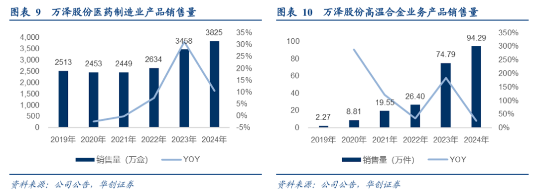 2019年至今,万泽股份医药制造业销量整体稳健增长,高温合金销量呈爆发式增长,双主业形成医药稳基、高温合金提速的格局。