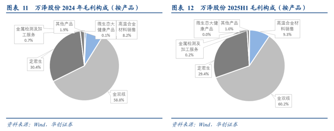 分产品看毛利:2024年金双歧毛利占比58.8%,定君生占比30.4%,高温合金材料销售毛利占比8.2%。2025年上半年毛利结构中,金双歧占比60.2%、定君生占比29.4%、高温合金材料销售占比9.3%。