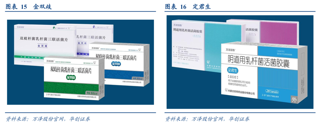 根据公司官网介绍:在微生态活菌产品方面,公司是国内唯一专注于消化和妇科两大微生态系统的企业,主要产品双歧杆菌乳杆菌三联活菌片(商品名称:“金双歧”)和阴道用乳杆菌活菌胶囊(商品名称:“定君生”),均是由人体原籍菌组成的微生态活菌制品,连续多年被纳入国家医保目录,在细分领域内具有较高的市场知名度和市场占有率。