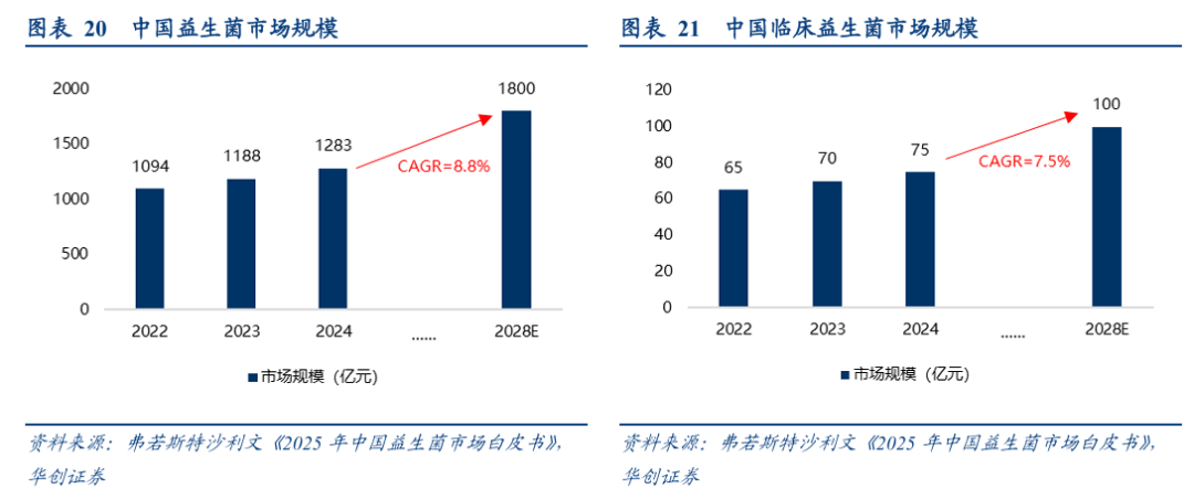 中国益生菌市场规模预计2028年将达到1800亿元,2024-2028年CAGR达到8.8%。