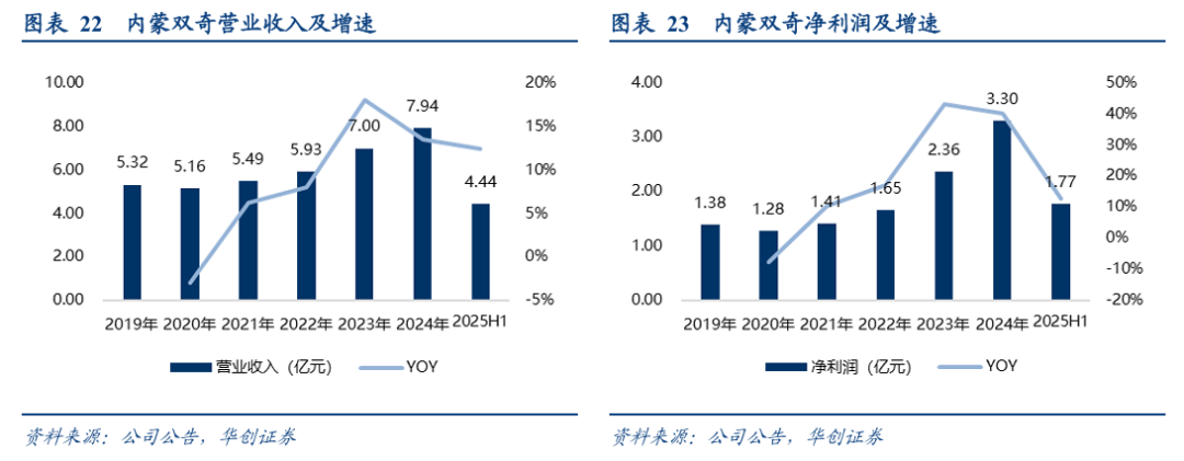 2024年,内蒙双奇实现营业收入7.94亿元,同比增长13.5%,占上市公司总收入的74%;净利润3.3亿元,同比增长40%,构成公司盈利与现金流的主要来源。