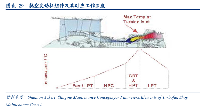 根据李文铨《发动机制造商另辟商机谈航空发动机售后服务和热端部件的典型修理技术》,航空发动机维护费用约51%用于购买航材,我们再假设热端部件占航材购买中的50%,则热端部件材料售后市场规模达40亿美元/年(160亿美元*51%*50%),对应约280亿人民币/年。(交叉验证:按照160亿美元/年*叶片占比26.3%测算,相当于295亿元人民币/年规模)