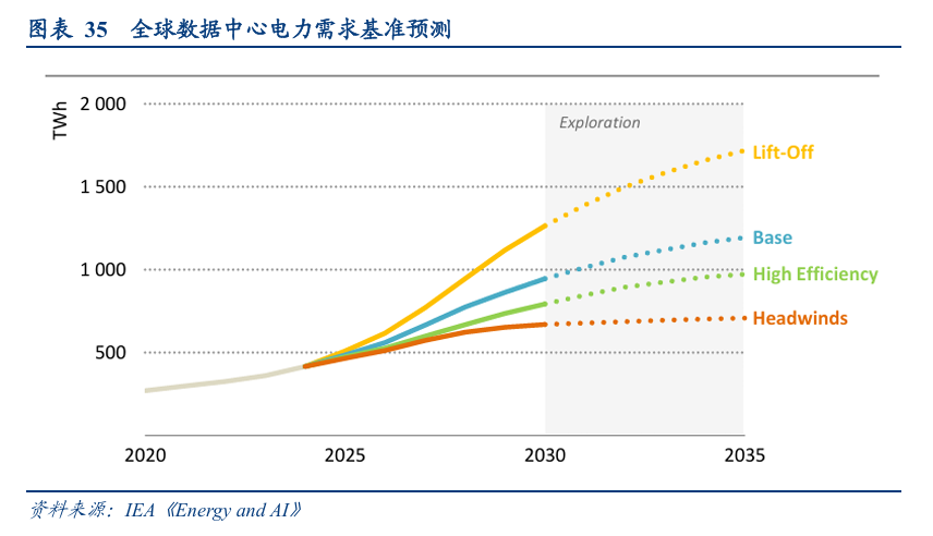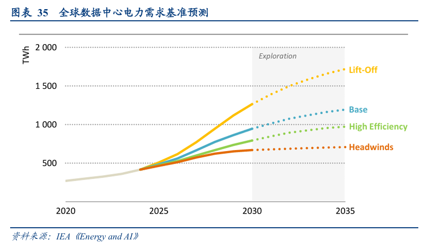 IEA在《Energy and AI》中对不同情景下全球数据中心耗电量进行预测:在基本情景中,全球为数据中心供电的发电量预计将从2024年的460 TWh增长到2030年的超过1000 TWh,到2035年达到1300 TWh。在最为保守的逆风情景下,耗电量约为700 TWh,占全球电力需求近2%;在高效情景下,通过软件优化、硬件升级和PUE改善等措施,耗电量约为970 TWh,占比升至2.6%;而在技术应用最为激进的起飞情景下,耗电量则突破1700 TWh,占比达到4.4%。