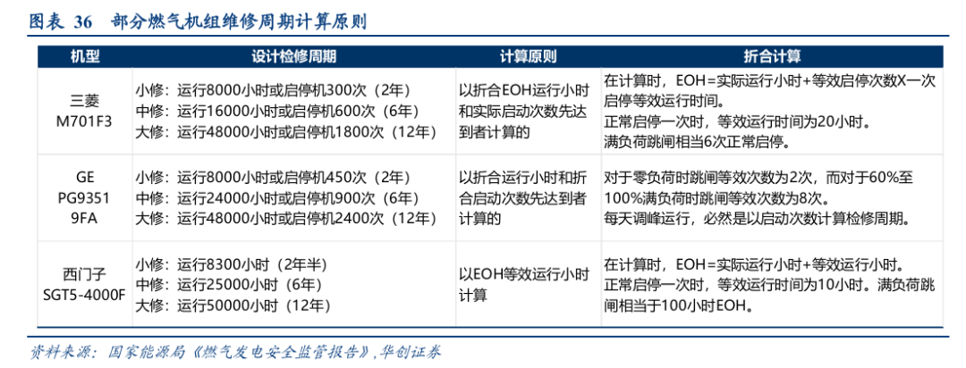根据国家能源局《燃气发电安全监管报告》,参考国际燃气轮机龙头主要机型,燃气轮机小修、中修和大修的周期分别约2年、6年和12年。
