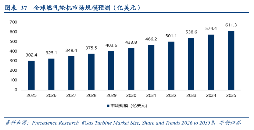 根据Precedence Research《Gas Turbine Market Size, Share and Trends 2026 to 2035》,2025年全球燃气轮机市场规模为302.4亿美元,预计到2035年将达到611.3亿美元,从2025年到2035年的复合年增长率为7.3%。