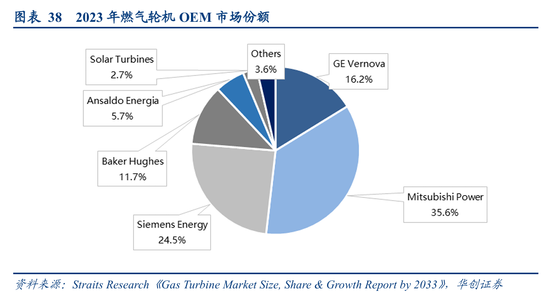 全球燃气轮机市场高度集中,美国通用电气(GE Vernova)、日本三菱电力(Mitsubishi Power)和德国西门子能源(Siemens Energy)主导全球市场,根据Straits Research《Gas Turbine Market Size, Share & Growth Report by 2033》,2023年三巨头合计占据约76%的市场份额。
