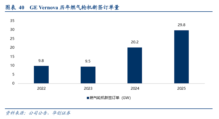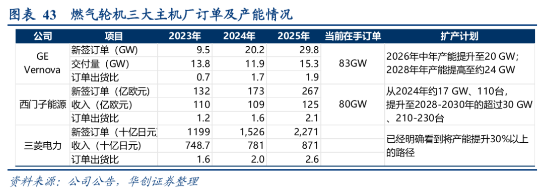 头部企业订单饱满,如GE Vernova,截至2025年底燃气轮机积压订单和产能预订协议从62 GW增至83 GW,计划在2026年年中将燃气轮机年产能提升至20 GW,到2028年将年产能提高至约24 GW,2029 年的产能目前已基本售罄;