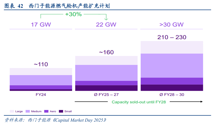 此前,公司在2025年11月资本市场日上披露,其燃气轮机的产能目标是从2024年的约17 GW、110台,提升至2028-2030年的超过30 GW、210-230台。目前直至2028财年的燃气轮机产能已售罄。