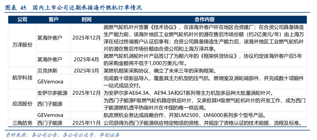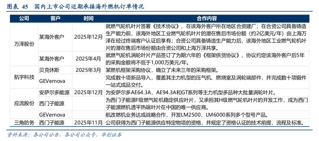 随着海外龙头产能瓶颈加剧,国内厂商凭借快速响应能力及持续扩大的产能储备,已加速切入全球燃机供应链。近期,万泽股份、应流股份、三角防务等多家企业相继斩获海外燃机叶片长期框架协议或批量订单,标志着我国已基本完成从材料突破到部件出口再到全球配套的能力跨越。
