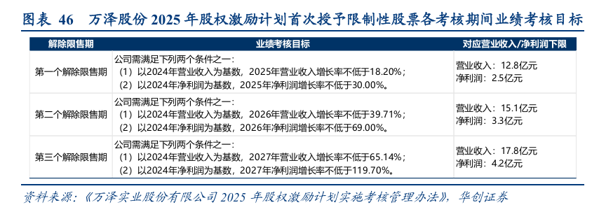 注:2025年,公司推出新一期股权激励计划,拟向激励对象授予600万股公司限制性股票。锚定2025-2027年业绩增长,营业收入与净利润目标满足其一方可解锁:营业收入方面,以2024年为基数,2025-27年增长率分别不低于18.2%、39.71%、65.14%,对应营业收入分别不低于12.8、15.1、17.8亿元;净利润方面,以2024年为基数,2025-27年增长率分别不低于30%、69%、119.7%,对应归母净利润分别不低于2.5、3.3、4.2亿元。