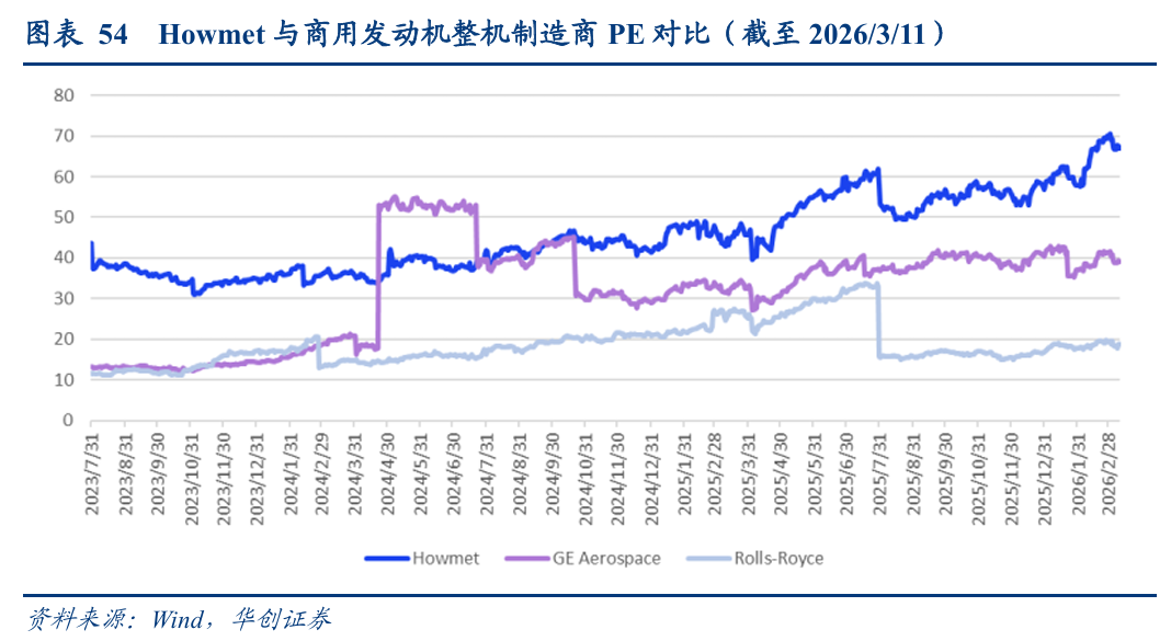 2、估值探讨:以Howmet为例看商发产业链的高估值。“卖铲人”高壁垒成长属性,产业链隐形冠军摇篮,HowmetPETTM超过60倍,高估值背后的核心逻辑在于:准入门槛极高,产品具备跨客户、跨平台适配能力(覆盖航空发动机与燃气轮机),需求同时受益于新机配套与维修替换,同时盈利稳定性更强,可避开整机制造的复杂整合难题。