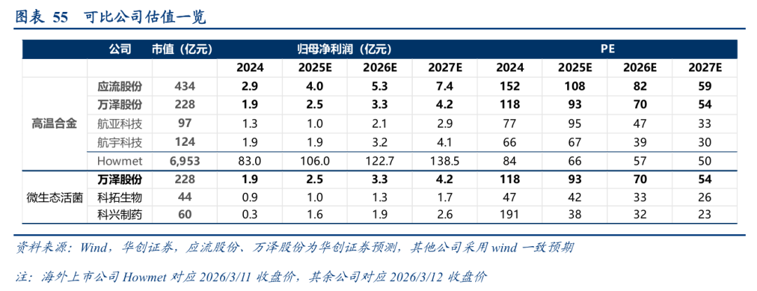 可比公司中,高温合金业务相关公司应流股份、航亚科技、航宇科技对应2027年PE分别为59、33、30倍,海外龙头Howmet对应2027年PE为50倍;微生态活菌业务相关标的科拓生物、科兴制药对应2027年PE分别为26、23倍。
