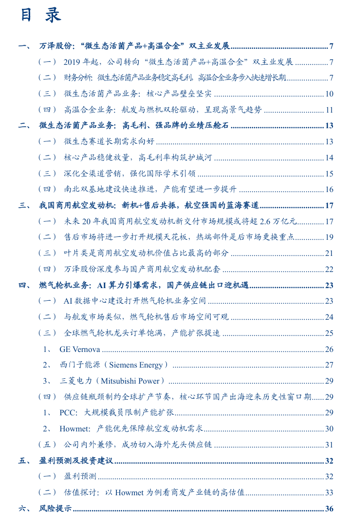 3、投资建议:我们看好公司高温合金业务,深度配套国产商用发动机,或受益于国产大飞机放量周期;切入西门子等海外燃气轮机龙头供应链,或受益于国产出海的历史性窗口期;此外,微生态活菌产品业务作为业绩压舱石有望依托产能瓶颈的突破,充分释放高毛利产品的增长潜力,在市场需求扩容与政策红利下打开新的成长空间。首次覆盖,给予“推荐”评级。