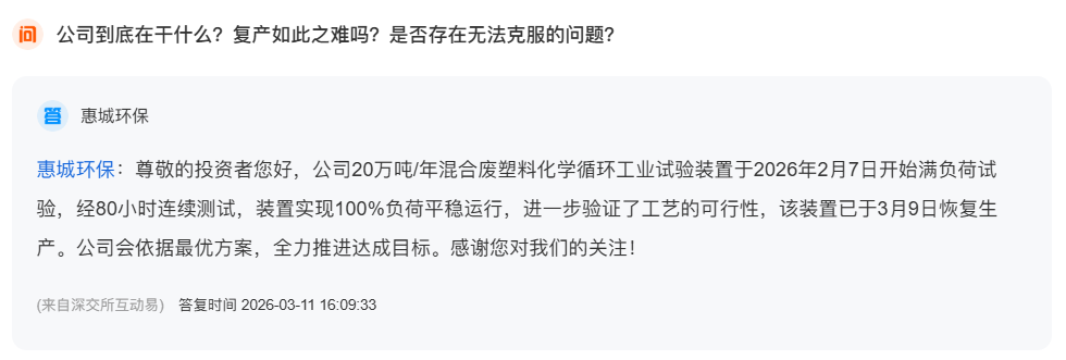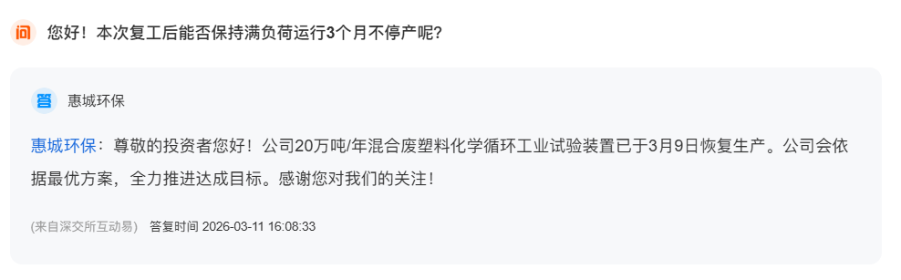 3月11日,青岛上市公司惠城环保(300779.SZ)在深交所互动易平台表示,公司旗下20万吨/年混合废塑料化学循环工业试验装置已于3月9日正式恢复生产。