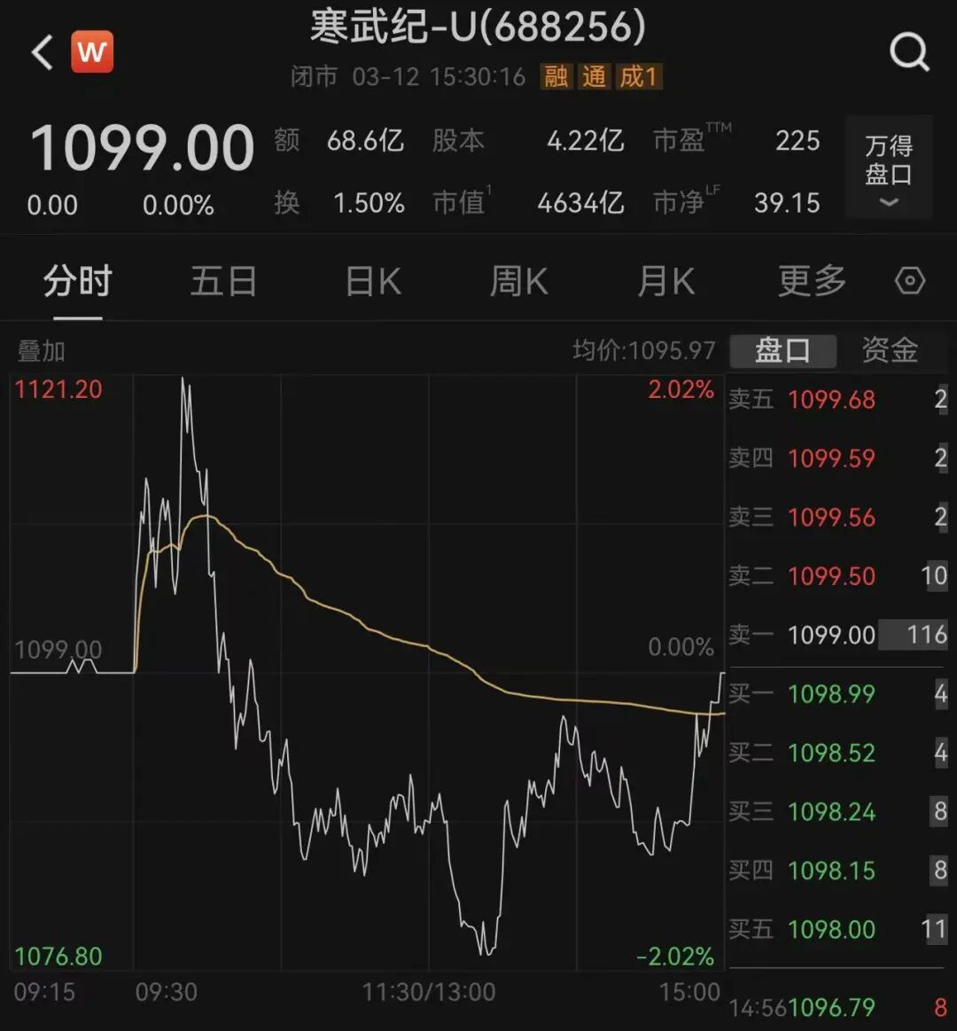去年8月27日盘中,寒武纪股价一度涨至1462元/股,超过贵州茅台成为A股股价最高的个股。去年8月28日,寒武纪收盘股价超1500元/股,市值超6600亿元。截至3月12日收盘,寒武纪股价报1099元/股,最新市值4634亿元,相比股价高点跌去近2000亿元。