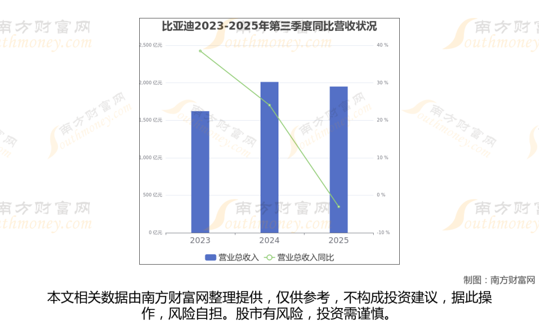 比亚迪2025年第三季度报告显示(如上图),公司实现主营业务收入1949.85亿元,较去年同期增长-3.05%。