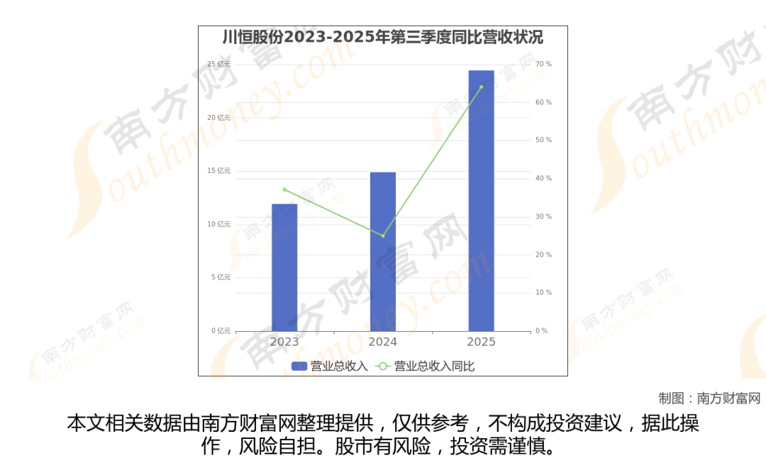 在2025年第三季度,川恒股份的业绩表现(如上图),主营业务收入达到24.44亿元,实现了64.09%的同比增长率。