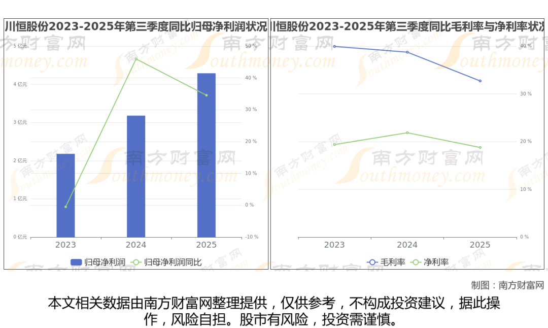 2025年第三季度季报显示,川恒股份公司毛利率32.71%,净利率18.77%,归属净利润4.29亿,同比增长34.56%。