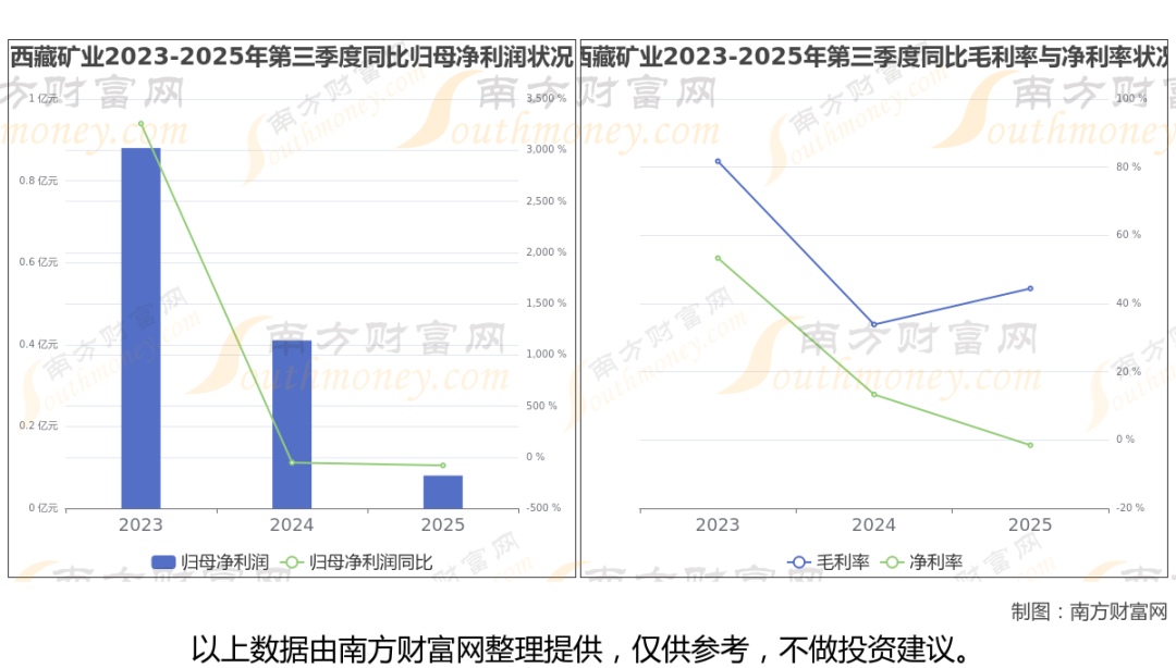 2025年第三季度季报显示,西藏矿业公司毛利率44.44%,净利率-1.5%,归属净利润808.76万,同比增长-80.36%。