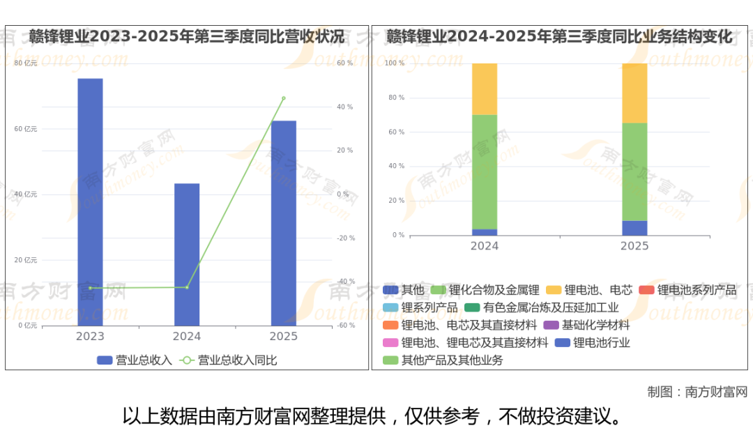 赣锋锂业披露了2025年第三季度财报。报告显示(如上图),赣锋锂业2025年第三季度实现营收62.49亿元,同比44.1%。