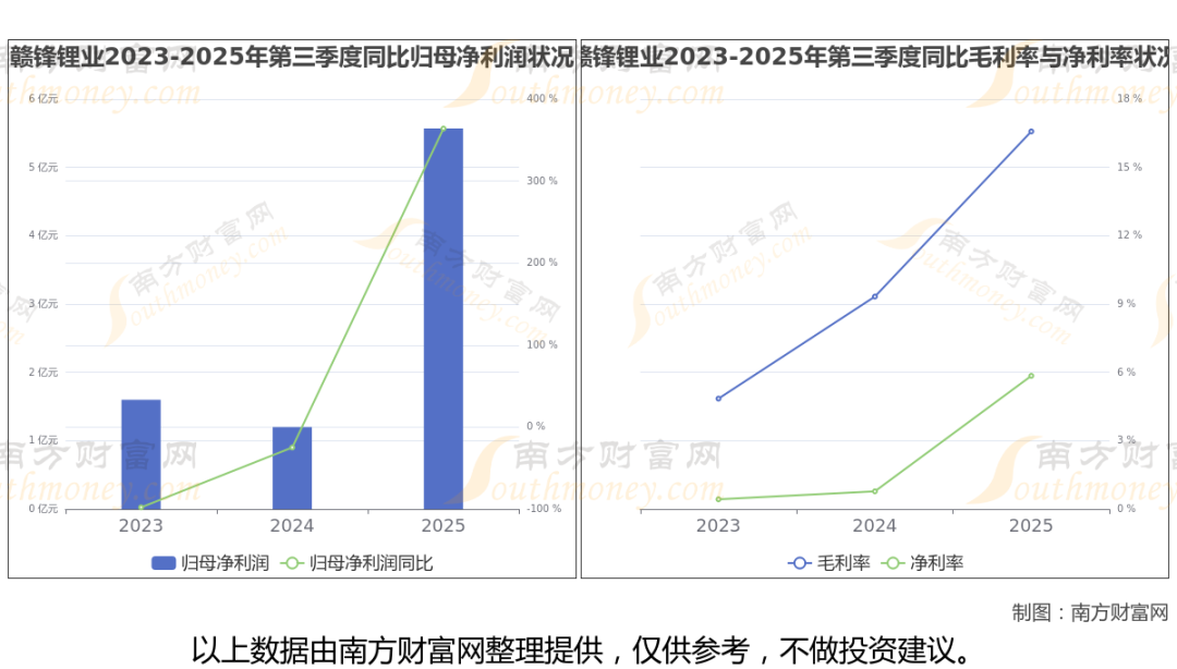 2025年第三季度季报显示,赣锋锂业公司实现净利润5.57亿,同比增长364.02%;毛利润为10.36亿,毛利率16.58%。