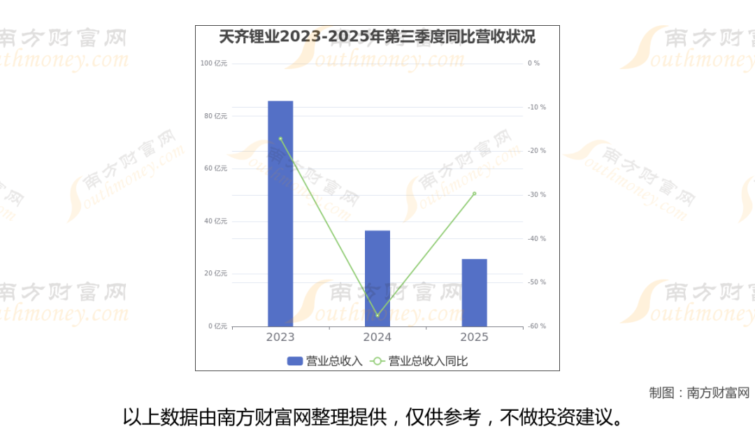 在2025年第三季度,天齐锂业的业绩表现(如上图),主营业务收入达到25.65亿元,实现了-29.66%的同比增长率。
