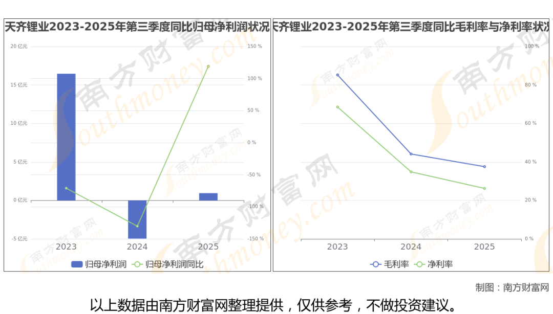 公司2025年第三季度季报显示,天齐锂业实现净利润9548.55万,同比增长119.26%;毛利润为9.63亿,毛利率37.57%。