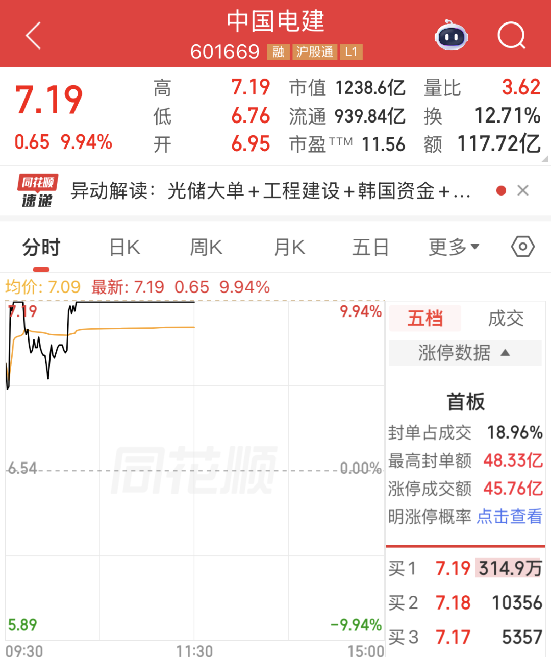 今日早盘,中国电建(601669)高开,震荡拉升后,盘中封住涨停板;截至午间休市,该股封单量达到314.91万手,封单资金达22.64亿元。