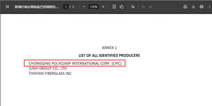 2025年8月,巴西对中国玻璃纤维发起反倾销调查,调查期为2023年7月至2024年6月,后延长为2019年7月至2024年6月,其中调查对象包括国际复材。