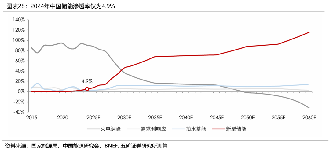 以中国为例,未来可新增的电力系统灵活调节能力主要分为四类:火电调峰、抽水蓄能、需求侧响应、新型储能,前三者都有明显的发展规模上限,未来新型储能需要逐步担起重任,成为系统灵活调节资源的提供主体。根据我们测算,2024年中国储能渗透率仅为4.9%,预计未来10年有望快速增长至70%左右。结合这一数据,我们认为新型储能目前的发展规模还远不及未来电力系统对它的需求,储能产业仍处在生命周期中的成长初期。