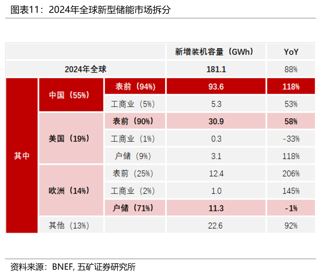 2024年全球锂电储能新增装机74GW/181GWh,分别同比增长66%/88%。2024年全球锂电储能新增装机中,中美欧各自占比55%/19%/14%。