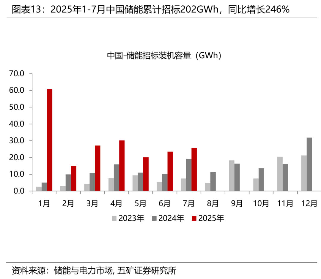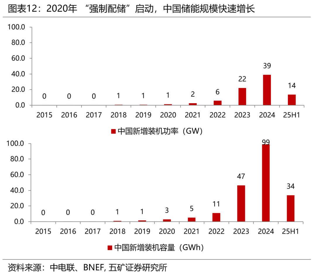 2024年中国锂电储能新增装机39GW/99GWh,同增77%/113%;25年上半年新增13.7GW/33.8GWh,同增32%/40%。