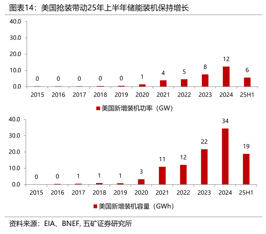 2024年美国锂电储能新增装机12GW/34GWh,同增63%/59%;25年上半年新增5.5GW/18.8GWh,同增35%/44%。