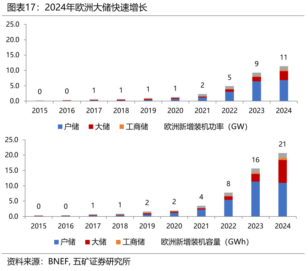 2022年俄乌冲突带动欧洲户储快速增长,随着电价回落,户储增速下滑;2024年开始欧洲大储成为增长主力,25年有望实现翻倍增长。