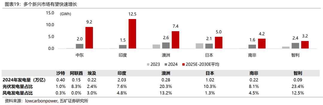储能新兴市场快速崛起,关注相关国家政策、发电量规模、风光占比等因素。