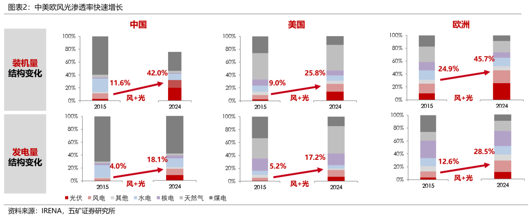 中美欧作为全球GDP最高的三大经济体,发电量也位居全球前三,2024年中美欧发电量分别达到10.1/4.4/2.7万亿kwh,分别占全球总发电量33%/14%/9%,合计占全球总发电量的56%。随着能源转型推进,中美欧各自的发电结构发生了显著变化,煤电、天然气等化石能源占比不断下降,风电、光伏等可再生能源占比快速增长。