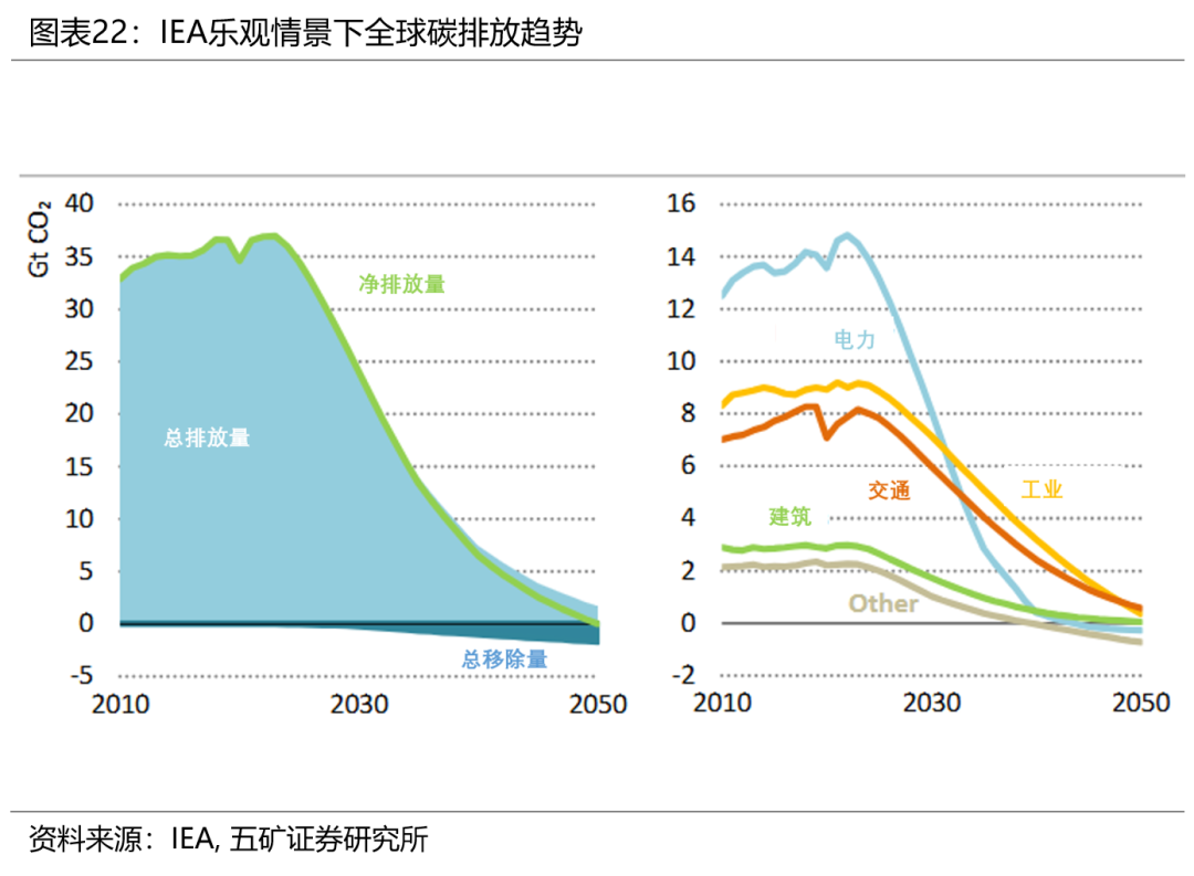 全球降碳路径实现路径可概括为:终端用能电气化,电力系统低碳化。