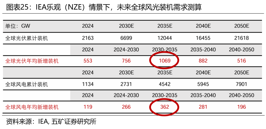 2024年全球光伏/风电分别新增装机553/119GW,预计峰值将出现在2030-2035年,光伏/风电分别年均新增1069/362GW。