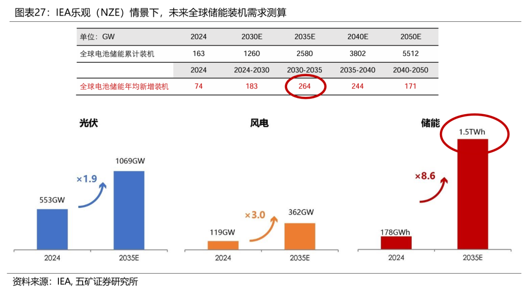 在确定未来全球需要建设多少光伏风电后,根据IEA模型测算,为了实现净零排放,2024年全球电池储能新增装机功率74GW,预计峰值同样出现在2030-2035年,年均新增装机功率264GW。我们测算出全球新型储能累计配储时长有望从2024年的2.3h增长至2035/2050年的3.8/5.0h,全球新型储能年新增装机容量峰值有望超过1.5TWh,储能电池出货量峰值有望超过2TWh/年。